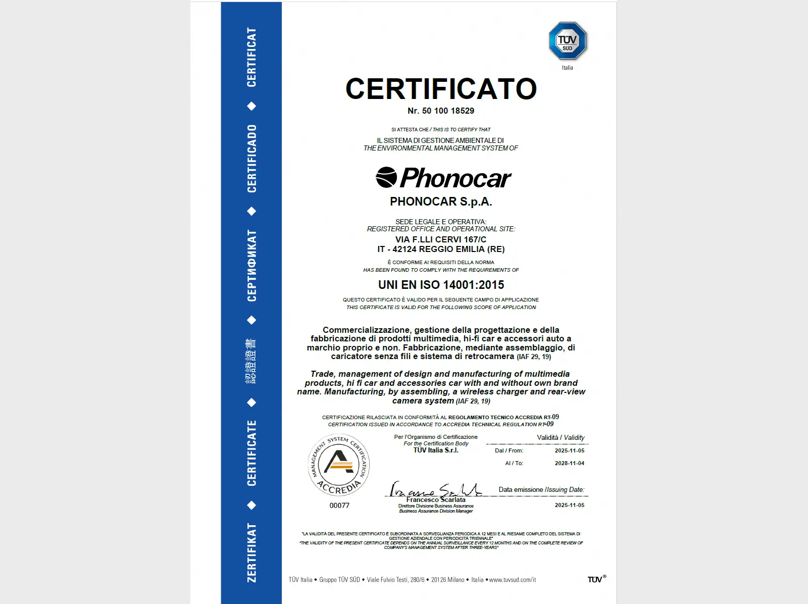 Siamo orgogliosi di annunciare che Phonocar ha tradotto il proprio impegno verso la sostenibilità ottenendo la Certificazione ISO 14001, lo standard internazionale che attesta un sistema di gestione ambientale efficace e responsabile.