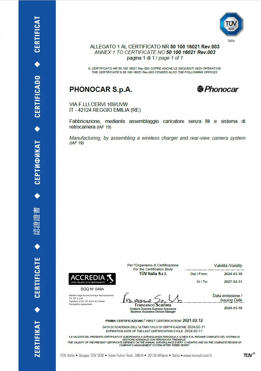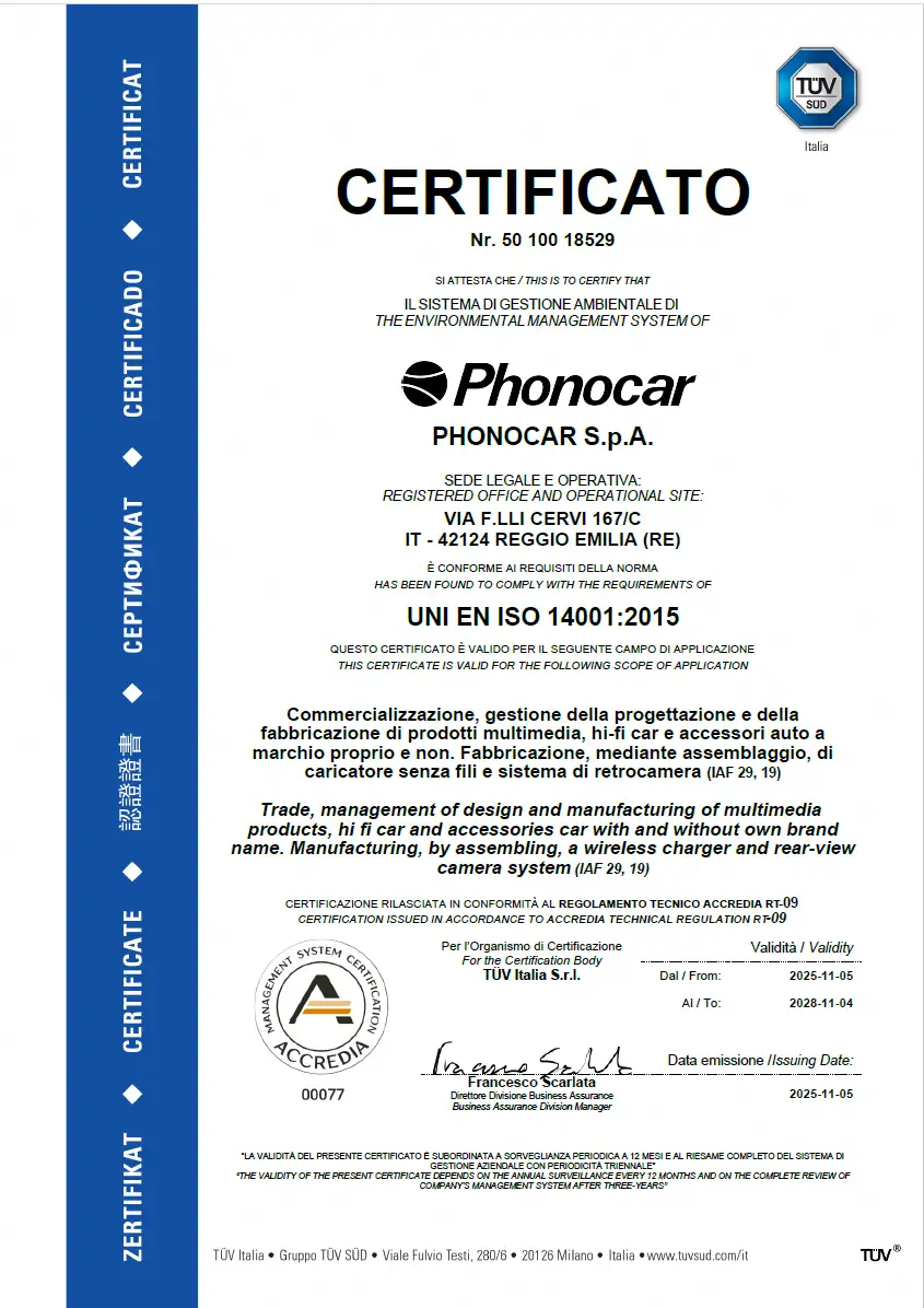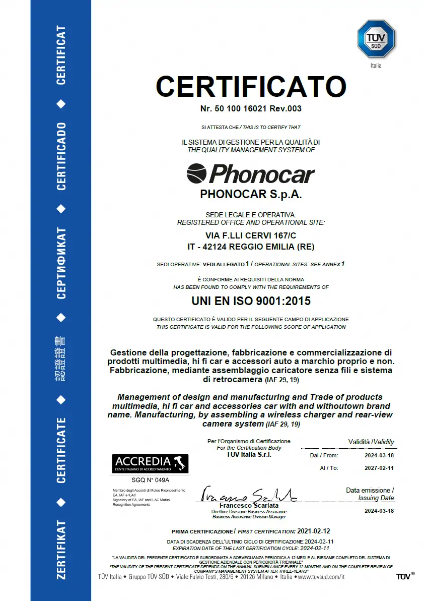 All images are included for illustrative purposes only. Phonocar S.p.A. reserves the right to make changes to the products even without notice. Any changes to the products are to be considered improvements and do not affect their functionality. All mentioned trademarks and reproduced logos belong to their legitimate owners and have been indicated for information purposes only.